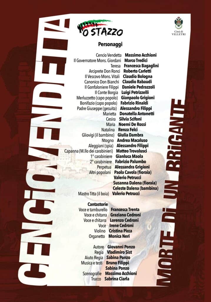 È una storia vera accaduta nel secolo scorso, quella di Cencio Vendetta, che ha ripreso vita attraverso le interpretazioni coinvolgenti dei protagonisti, Massimo Acchioni e Francesca Bagaglini nei panni di Cencio e Teresa Elisei, di Marco Tredici in quelli del governatore Monsignor Giordani, di Luigi Petrizzelli in quelli del Conte Borgia, di Claudio Bologna in quelli del Vescovo Monsignor Vitali, di Claudio Rabaudi in quelli del Canonico don Bianchi e di Roberto Carletti in quelli dell’Arciprete don Ronci. Accanto a loro, un popolo con i suoi capi, Giampaolo Grigioni e Fabrizio Rinaldi, e i suoi personaggi caratteristici, colmi di spontaneità e di vitalità, uomini, donne e bambini.