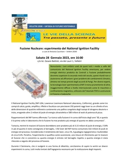 In sintesi, non facciamoci illusioni. Vi aspettiamo numerosi per parlarne insieme all’esperto Antonio Cucchiaro e confrontarci in una sorta di dibattito, mirato a creare conoscenze sul fenomeno e la consapevolezza sull’importanza dell’energia in quanto motore di ogni attività umana, e sui tentativi della scienza di trovare nuove vie per produrla in forma utilizzabile.