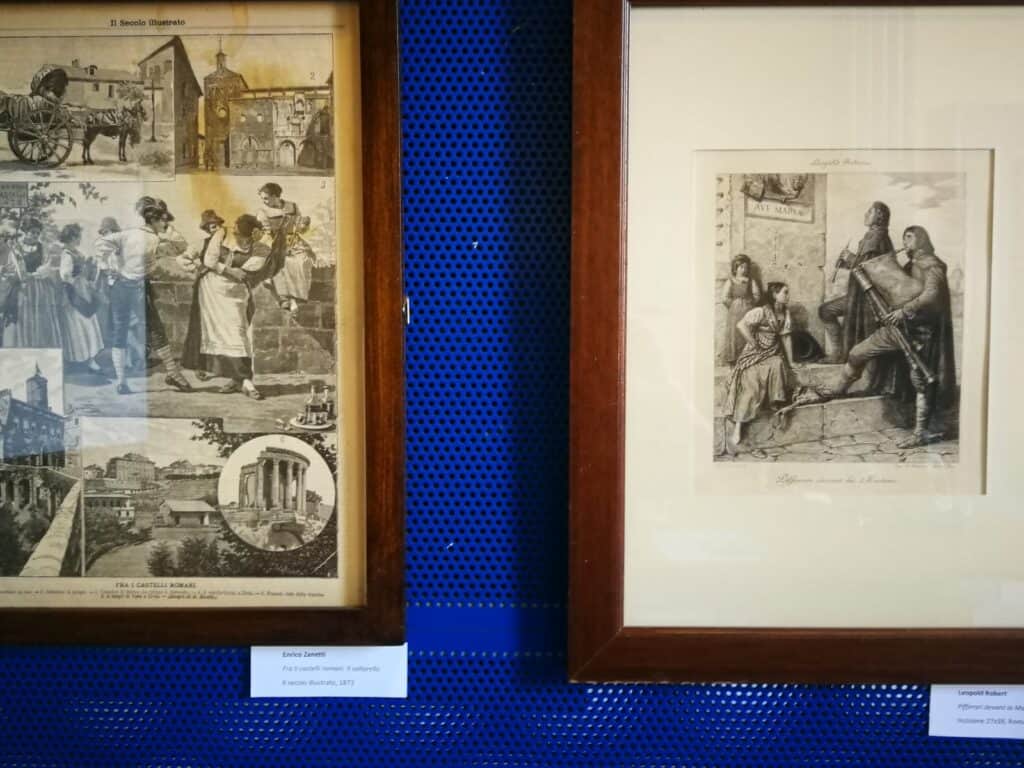 Esempio su tutti, il pittore svizzero Louis Leopold Robert, allievo del grande maestro David, che dopo il premio al Prix de Rome per l’incisione nel 1814, decide di trasferirsi in Italia dove dipinse quadri intensi di briganti e di contadine in abito caratteristico. L’opera che lo rese famoso fu il quadro “L’arrivo dei mietitori nelle Paludi Pontine” ora al museo del Louvre. Nella esposizione viene presentata una incisione dove l’artista dipinge la scena nella quale i mietitori danzanti accompagnano un carro che trasporta dei popolani trainato dai buoi.