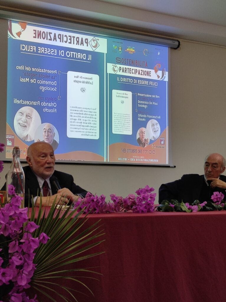 “Il diritto di essere felici”, questo il titolo del convegno, è uno dei più importanti: fondamentalmente tutti gli obiettivi dell’Agenda tendono a uno stile di vita migliore, più equo, sostenibile e inclusivo. Anche Domenico De Masi, sapientemente introdotto dal filosofo Orlando Franceschelli, ha cercato in qualche modo di rifarsi a quest’obiettivo: “questa ricerca è scritta con chiarezza cristallina di chi afferma certe cose con mano sicura, ha detto Franceschelli, “e affronta un argomento inevitabile sottraendosi al rischio della banalità. Ognuno di noi ha un’idea di felicità, c’è chi la nega e chi la ricerca. Il neoliberismo nella società odierna provoca la crescita, ci dice il professor De Masi, del numero di cittadini in condizioni oggettive di infelicità. Passiamo dalla negazione della felicità all’oggettiva condizione di infelicità in una società che dovrebbe mettere al centro il bene”.