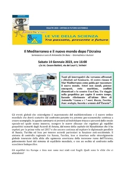 “Il Mediterraneo e il nuovo mondo dopo l’Ucrania“ è il titolo del Seminario, che si terrà sabato 14 gennaio 2023 c/o IISS Cesare Battisti, via dei Lauri 1, con inizio alle ore 16:00. L’incontro prende spunto dal libro “Astana e i 7 mari. Russia, Turchia, Iran: orologio, bussola e sestante dell’Eurasia” e vede protagonista l’autrice del libro, Antonella De Biasi. Il libro ha come punto di partenza gli accordi di Astana nati dagli incontri tenutisi nella capitale del Kazakistan (oggi Nur-Sultan) per facilitare la soluzione militare in Siria nella prospettiva di un futuro cessate il fuoco sotto la supervisione delle tre potenze locali in gioco ovvero Russia, Turchia e Iran. Nel volume, si legge in un comunicato stampa dell’editore OGzero, “non c’è spazio solo per il mare nostrum anche se è un mare che metaforicamente contiene tutti gli altri, un tesoro blu che irradia il suo ascendente verso le vie fluviali e gli snodi marittimi più nascosti ma si inseriscono diversi tasselli: il bastione cinese nel Mediterraneo orientale, il Canale di Suez, lo stretto dei Dardanelli, gli echi del caos proveniente da Levante o il golfo Persico. Il punto di vista mediterraneocentrico di questo continuo salpare chiama in causa il fatto che il Mediterraneo non è solo un crocevia liquido ma un contenitore di intrecci fitti dell’economia che disegnano per noi la società”.