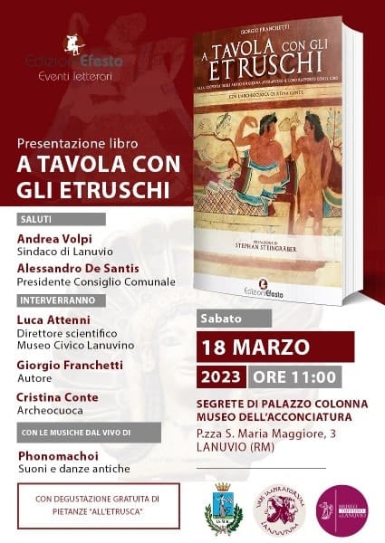 Si prosegue poi sabato mattina alle ore 11:00 al Cantinone – le Segrete di Palazzo Colonna con la presentazione del libro: “A tavola con gli etruschi”. Vi saranno i saluti istituzionali da parte del Sindaco Andrea Volpi e del Presidente del Consiglio Alessandro De Santis e interverranno l’autore Giorgio Franchetti, l’archeocuoca Cristina Conte e il direttore del Museo diffuso di Lanuvio Luca Attenni. Al termine della presentazione avrà luogo una piccola degustazione gratuita di pietanze all’etrusca.