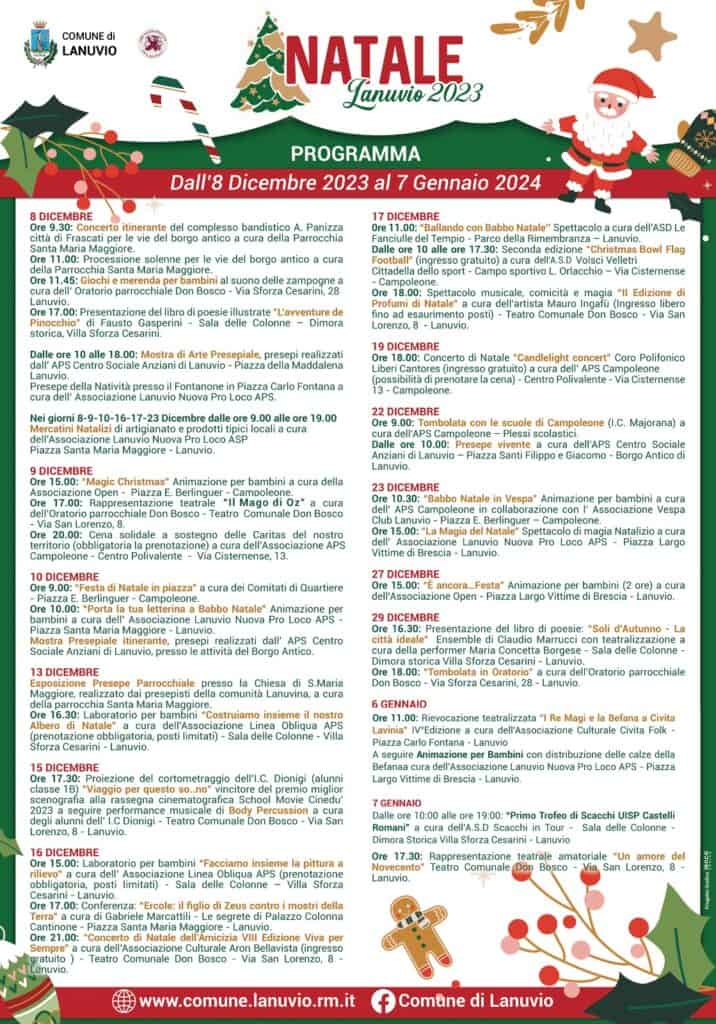 Il Comune di Lanuvio si appresta a trascorrere le festività natalizie all’insegna della cultura e della tradizione. “Anche quest’anno – ha commentato Irene Quadrana Assessore agli Eventi di Lanuvio – abbiamo voluto coinvolgere tutte le realtà del territorio nella realizzazione degli eventi natalizi. Tradizione, storia, condivisione, divertimento e allegria sono le parole d’ordine che ci hanno guidato nella costruzione del ricco calendario di eventi che accompagnerà i lanuvini durante il periodo più magico dell’anno. Tante le iniziative in programma, per tutti i gusti e per tutte le età: dai classici mercatini natalizi alle mostre di presepi; dai giochi e le animazioni per i bambini ai concerti, dagli spettacoli teatrali al torneo di scacchi. Una menzione particolare merita la proiezione del cortometraggio “Viaggio per questo so…no” realizzato dagli alunni della 1B dell’istituto comprensivo Marianna Dionigi e vincitore del premio miglio scenografia alla rassegna cinematografica “School Movie Cinedù 2023”. Con l’inaugurazione delle luminarie – ha concluso Quadrana – il comune di Lanuvio accende il Natale con l’obiettivo di trascorrerlo tutti insieme per entrare nel nuovo anno con uno spirito di comunità sempre più spiccato”.