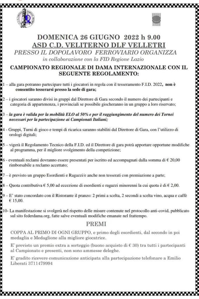 Domenica al DLF il Campionato Regionale di Dama