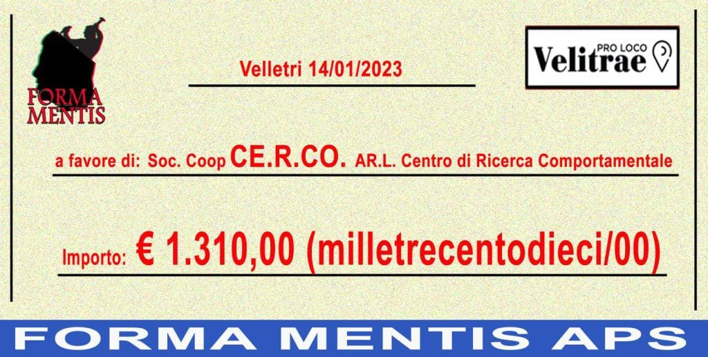 Consegnato ufficialmente alla Coop. Ce.R.Co l’assegno di beneficienza derivato dai proventi donati dagli spettatori intervenuti in occasione dello spettacolo teatrale “Una famiglia 3.0”. Commedia presentata dall’APS Forma Mentis presso il teatro Artemisio Gian Maria Volontè il 27 dicembre 2022, nell’ambito del Natale veliterno, in collaborazione con la Pro loco Velitrae e l’assessorato allo sport e al turismo del Comune di Velletri.