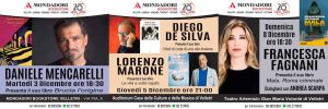 Tutte le serate prevedono il firma-copie finale e le foto-ricordo, con possibilità di acquistare il libro in Auditorium. Per informazioni sono disponibili i numeri 0696155094 e 3332779015. Quattro incontri che rappresentano un’occasione imperdibile per i lettori e per gli appassionati, con temi e generi letterari diversi e personaggi di spessore indiscutibile. Un programma, dunque, tutto da vivere per la rassegna “Velletri Libris Christmas Edition”.